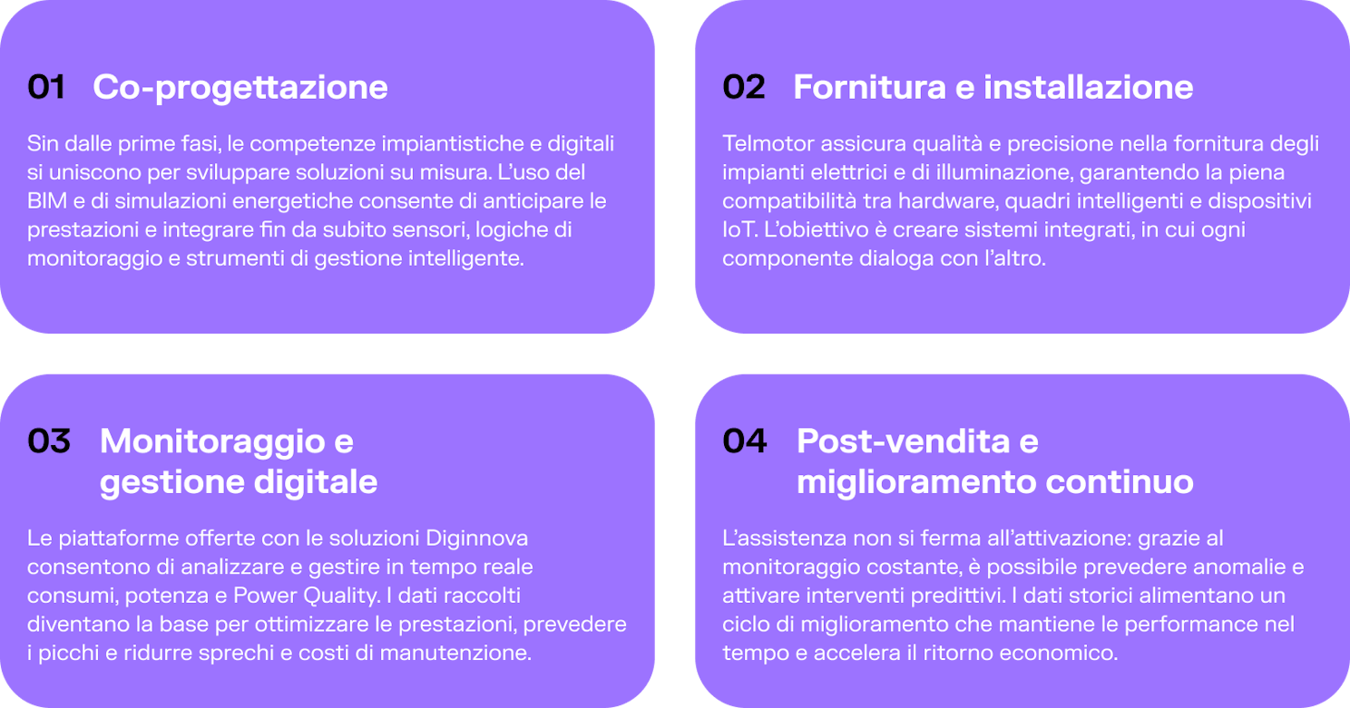 L’approccio integrato di Telmotor e Diginnova copre l’intero ciclo di vita dell’impianto, trasformando ogni progetto in un ecosistema intelligente, efficiente e monitorato in continuo. Dalla fase di ideazione fino al supporto post-vendita, ogni passaggio è pensato per garantire continuità, qualità e ritorno dell’investimento.